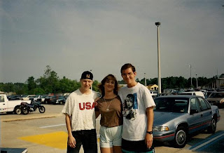 Finally, I bring you this. Me, dressed for that same half credit of tennis...WITH MY SHIRT TUCKED INTO MY ELASTIC WAIST SHORTS...and two boys I don't remember...at all.